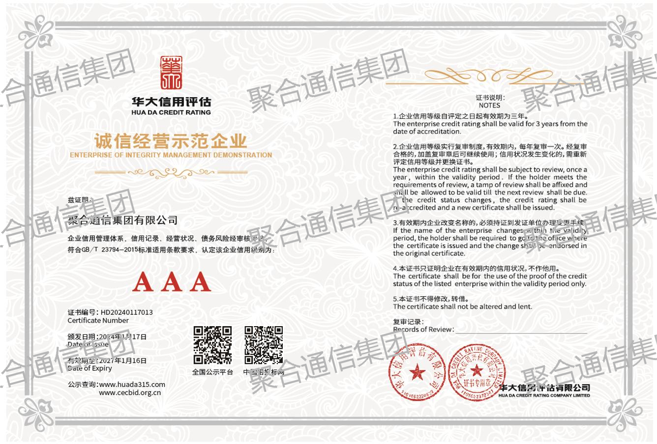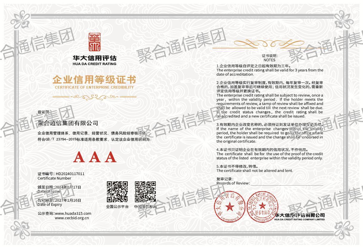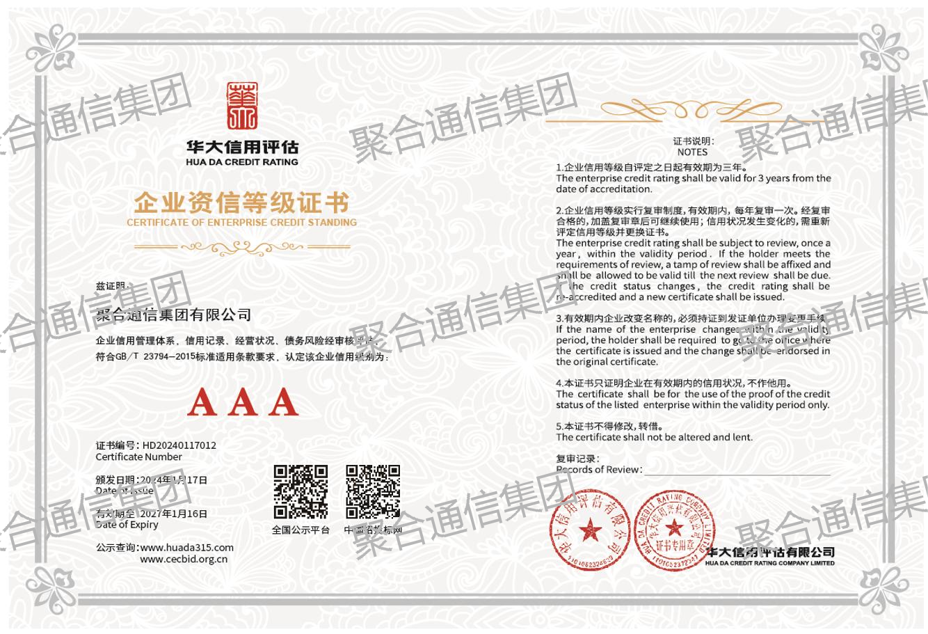 聚合通信集团有限公司现已获得通信工程总承包壹级、电力工程施工总承包资质、石油化工工程施工总承包、建筑工程施工总承包、电子与智能化专业承包一级资质、建筑机电安装工程专业承包、环境工程专业承包、钢结构工程专业承包、通信信息系统集成、通信用户管线施工资质、公安厅颁发的安防监控资质、陕西省通信管理局颁发的网络托管资质、安全技术防范从业单位一级资质,并通过了ISO9001质量管理体系、ISO14001环境管理体系、OHSAS18001职业健康安全管理体系的认证,获得国家工商行政管理总局商标局的注册品牌:“CIAC”商标证书。