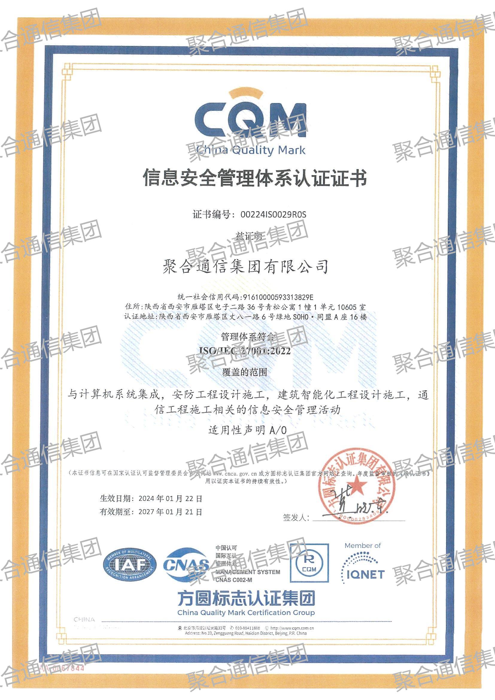 聚合通信集团有限公司现已获得通信工程总承包壹级、电力工程施工总承包资质、石油化工工程施工总承包、建筑工程施工总承包、电子与智能化专业承包一级资质、建筑机电安装工程专业承包、环境工程专业承包、钢结构工程专业承包、通信信息系统集成、通信用户管线施工资质、公安厅颁发的安防监控资质、陕西省通信管理局颁发的网络托管资质、安全技术防范从业单位一级资质,并通过了ISO9001质量管理体系、ISO14001环境管理体系、OHSAS18001职业健康安全管理体系的认证,获得国家工商行政管理总局商标局的注册品牌:“CIAC”商标证书。